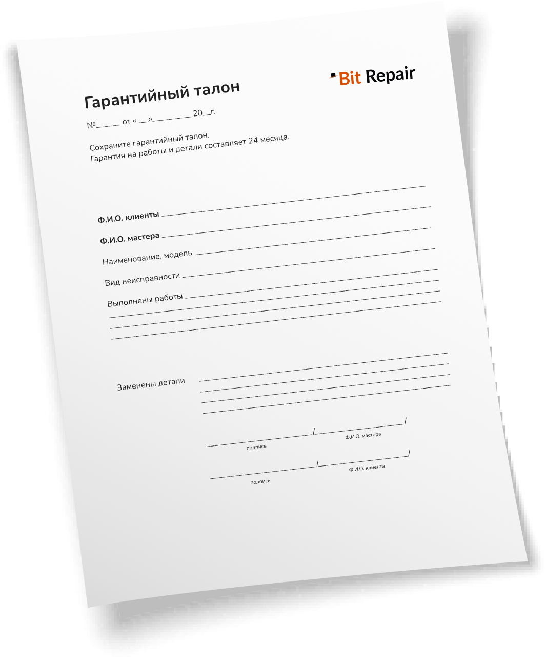 Наш сервисный центр отвечает по всем обязательствам, взятым перед клиентами. Поэтому после завершения ремонта мастер предоставляет гарантийный талон, который действует на услуги и комплектующие. Срок гарантии ― 2 года.
